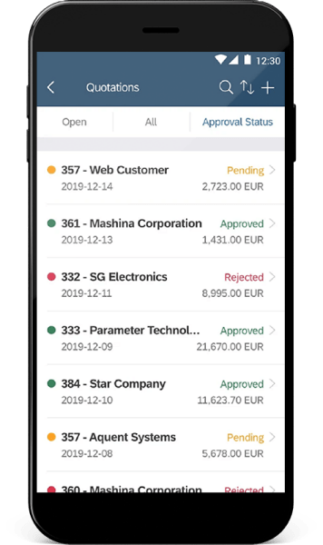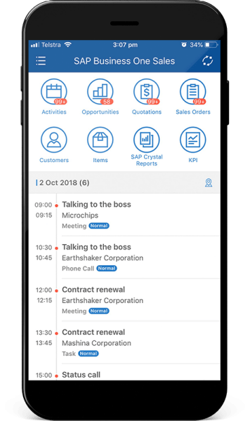 مع تطبيقات SAP Business One للأجهزة المحمولة، يمكنك الوصول الفوري إلى المعلومات الأكثر صلة لمساعدتك على إدارة أعمالك من أي مكان وفي أي وقت. هناك 3 تطبيقات للأجهزة المحمولة: تطبيق المبيعات على الأجهزة المحمولة، وتطبيق الخدمات على الأجهزة المحمولة، وتطبيق الإدارة على الأجهزة المحمولة للموافقات والتقارير.